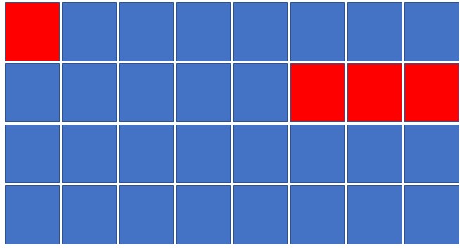 The memory address is split into two sections, one section specifies the row and the other specifies the column. So, the internals of DRAM make it much more efficient to read an entire row. Looking at the 2D array below, the memory controller must sequence two reads to read bits 7-10 whereas it only needs one read to read bits 0-7. Notice that bits 7-10 are in two different rows. The bits we want to read are colored red in the figure below.