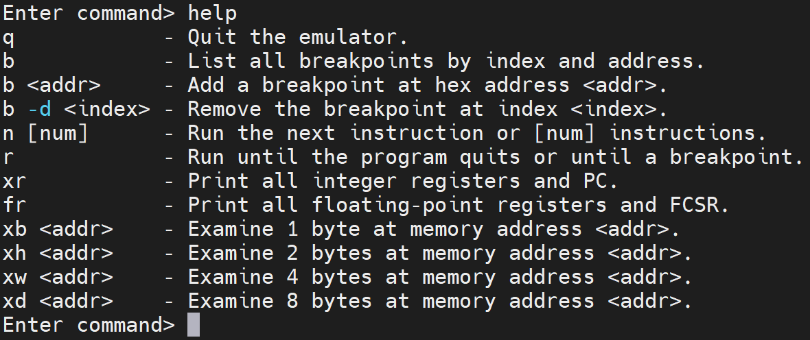 You must support the EBREAK instruction. This instruction is an explicit breakpoint instruction. It looks much like the ECALL instruction except one bit is flipped to 1. When the ebreak instruction is reached, your program must return back to the prompt.