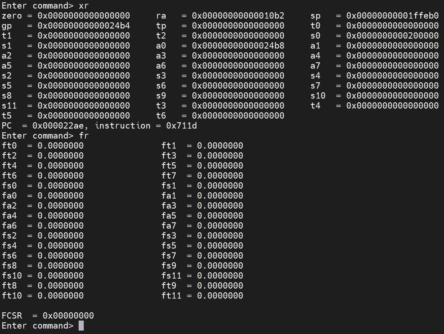 The fr (or fsr and fdr) will print out all of the floating-point registers using their ABI names followed by an equals sign followed by the value precise to 8 digits. If you implement the FCSR, the fr command will also print it. Otherwise, omit it.