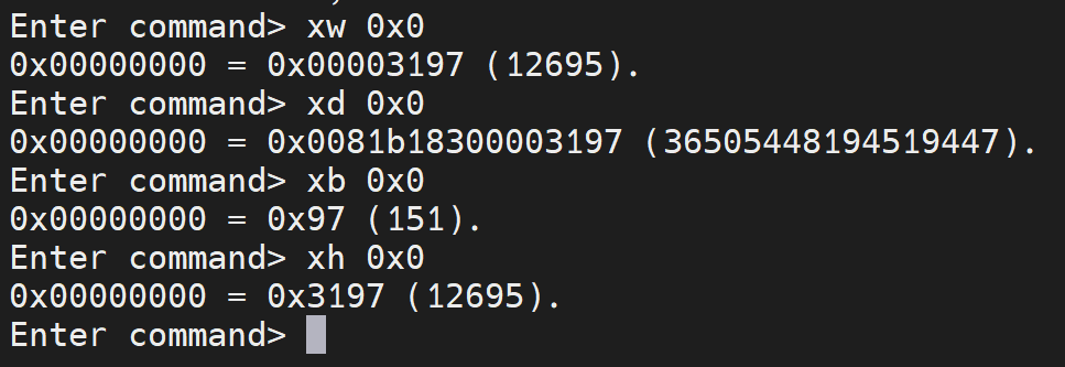 The xb, xh, xw, and xd commands will allow the user to examine a byte, half-word (2 bytes), word (4 bytes), and a doubleword (8 bytes), respectively. You will print the address, the value in hex and then the value in decimal.