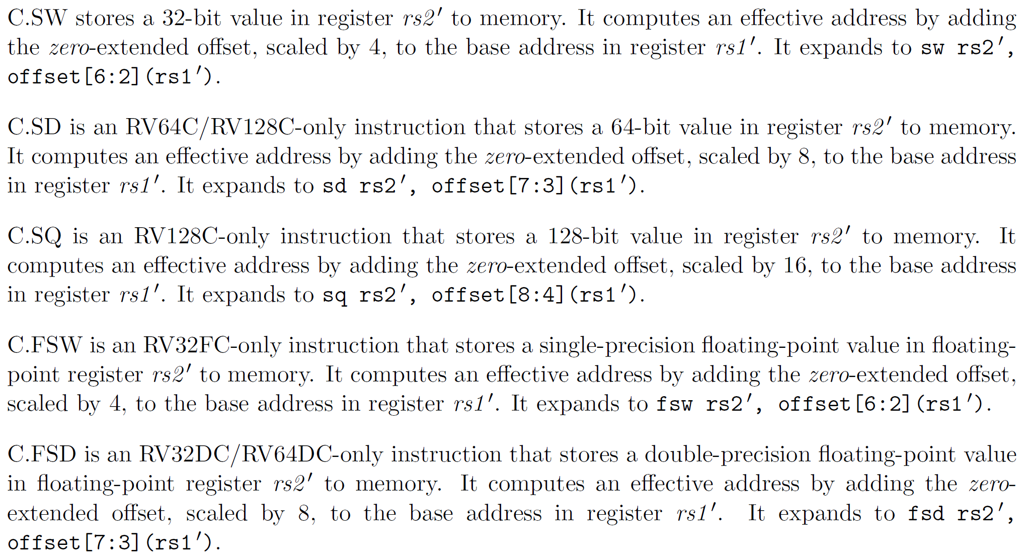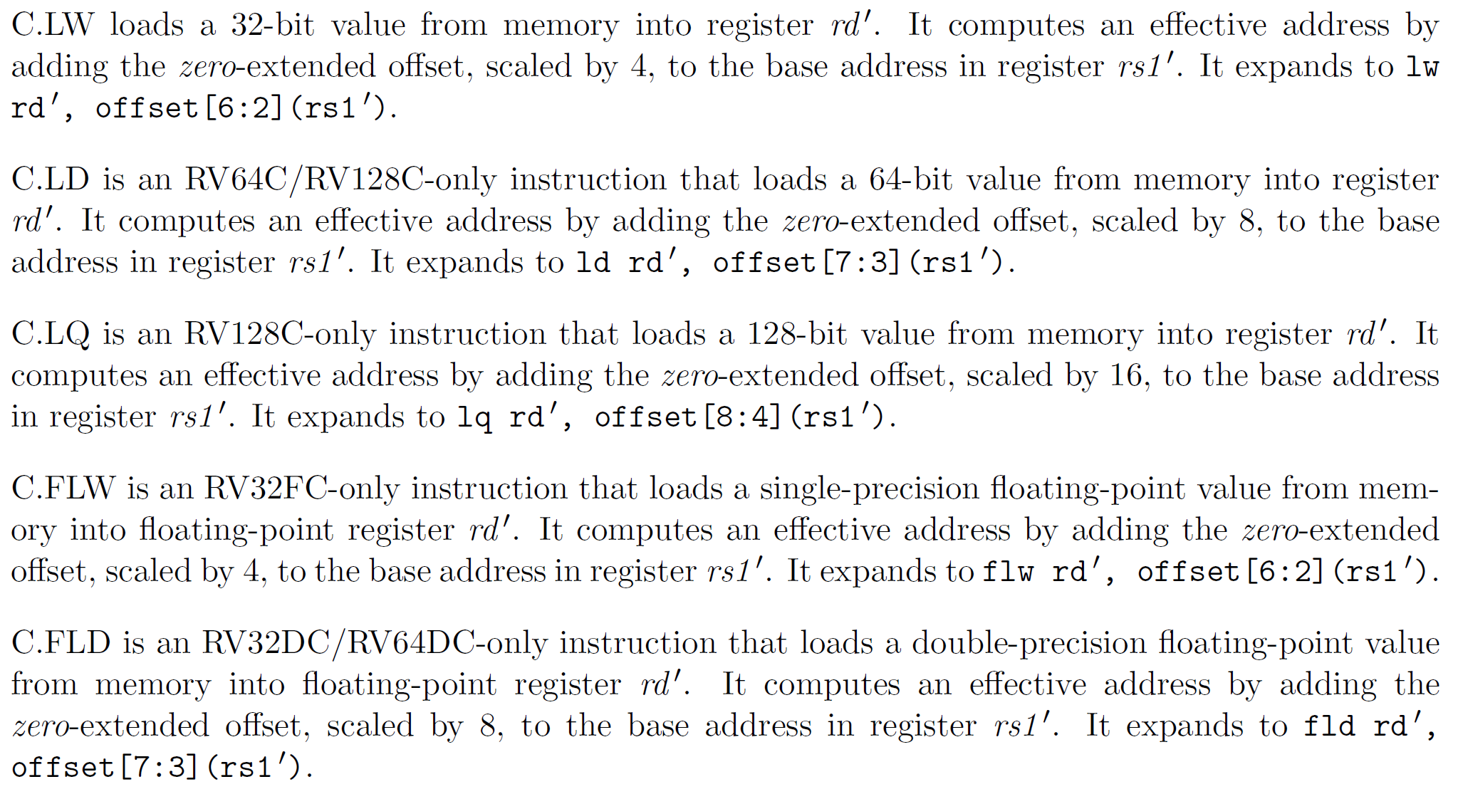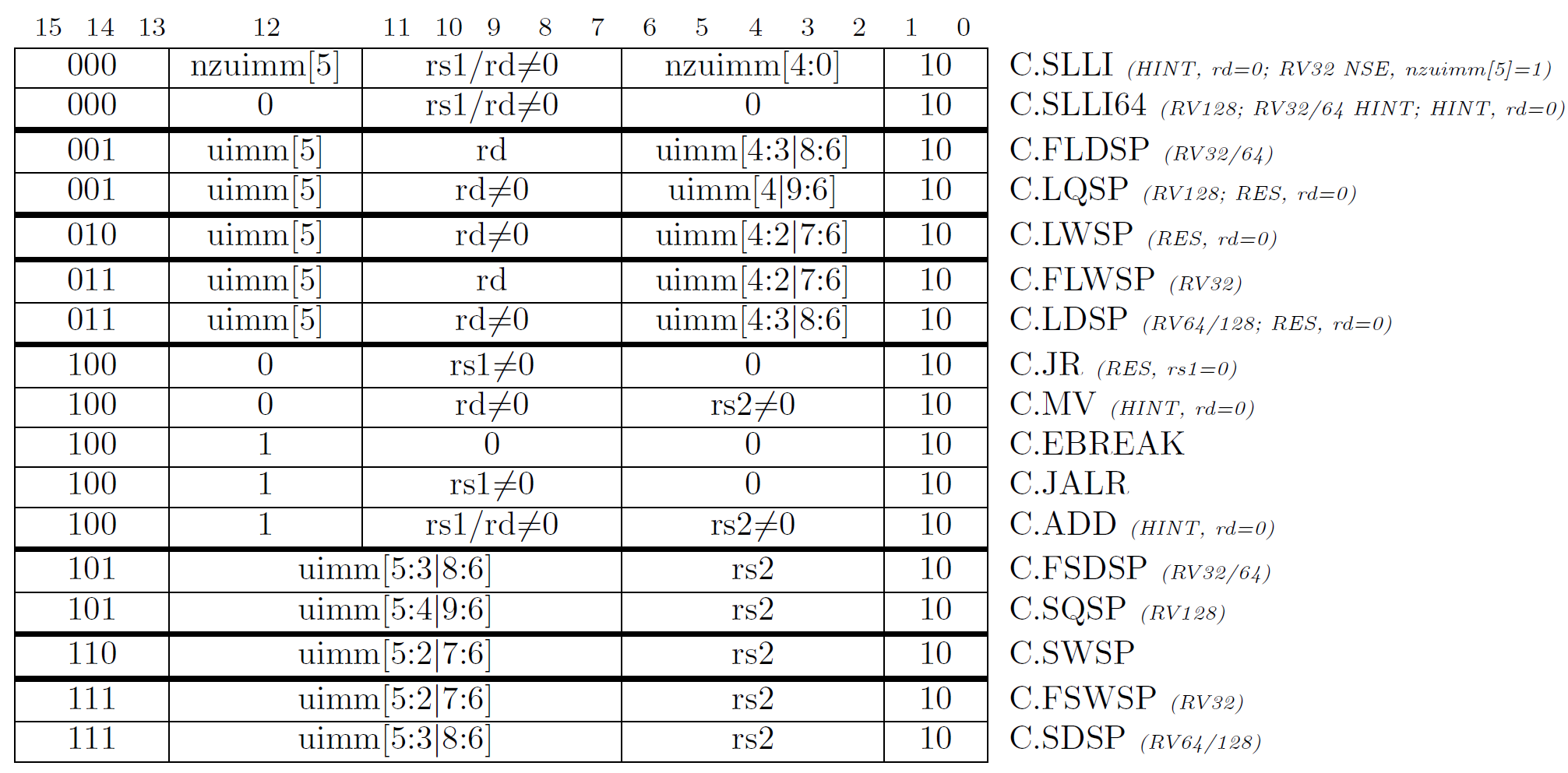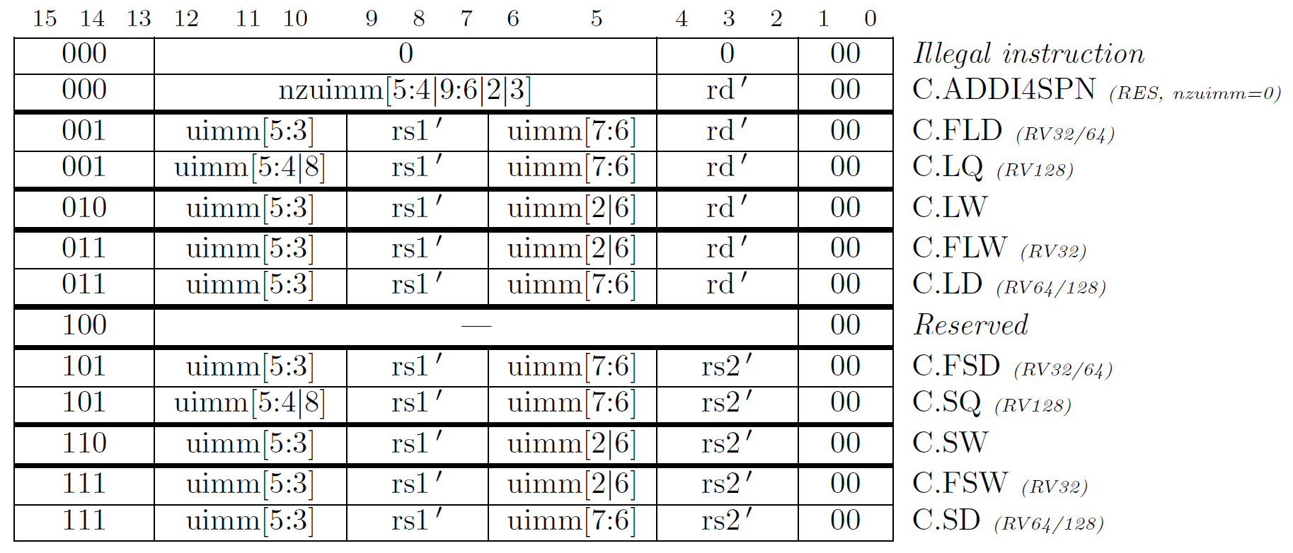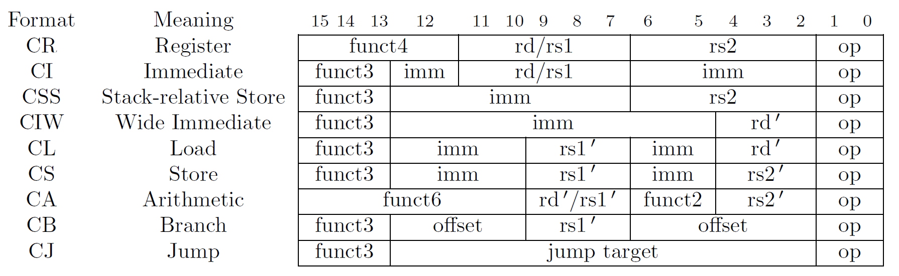 RV64C has several instruction types, and the format is ‘weird’ to say the least. This is mainly to account for the much shorter instruction size.
