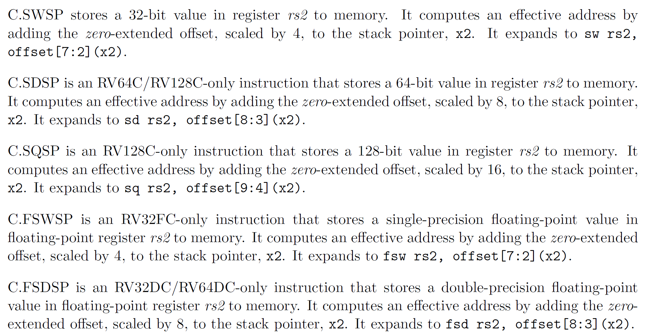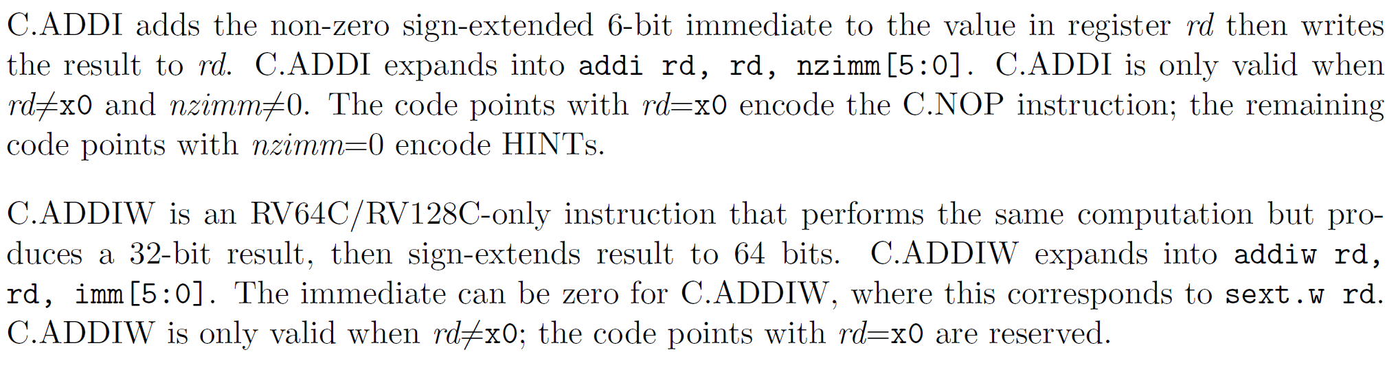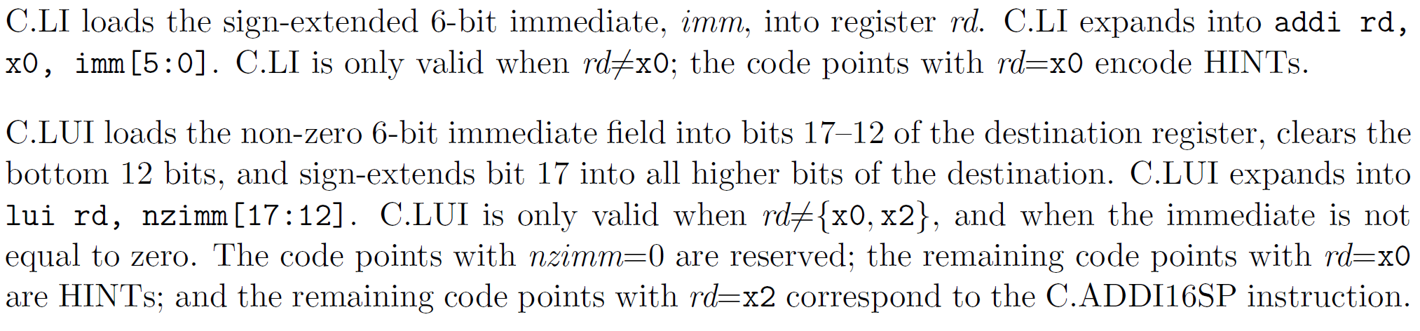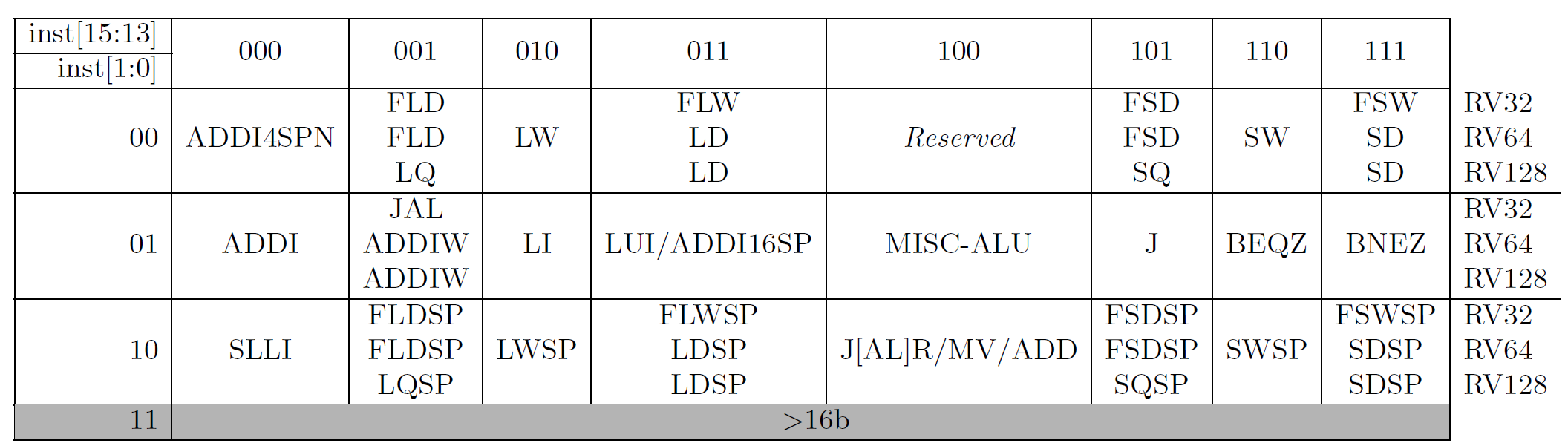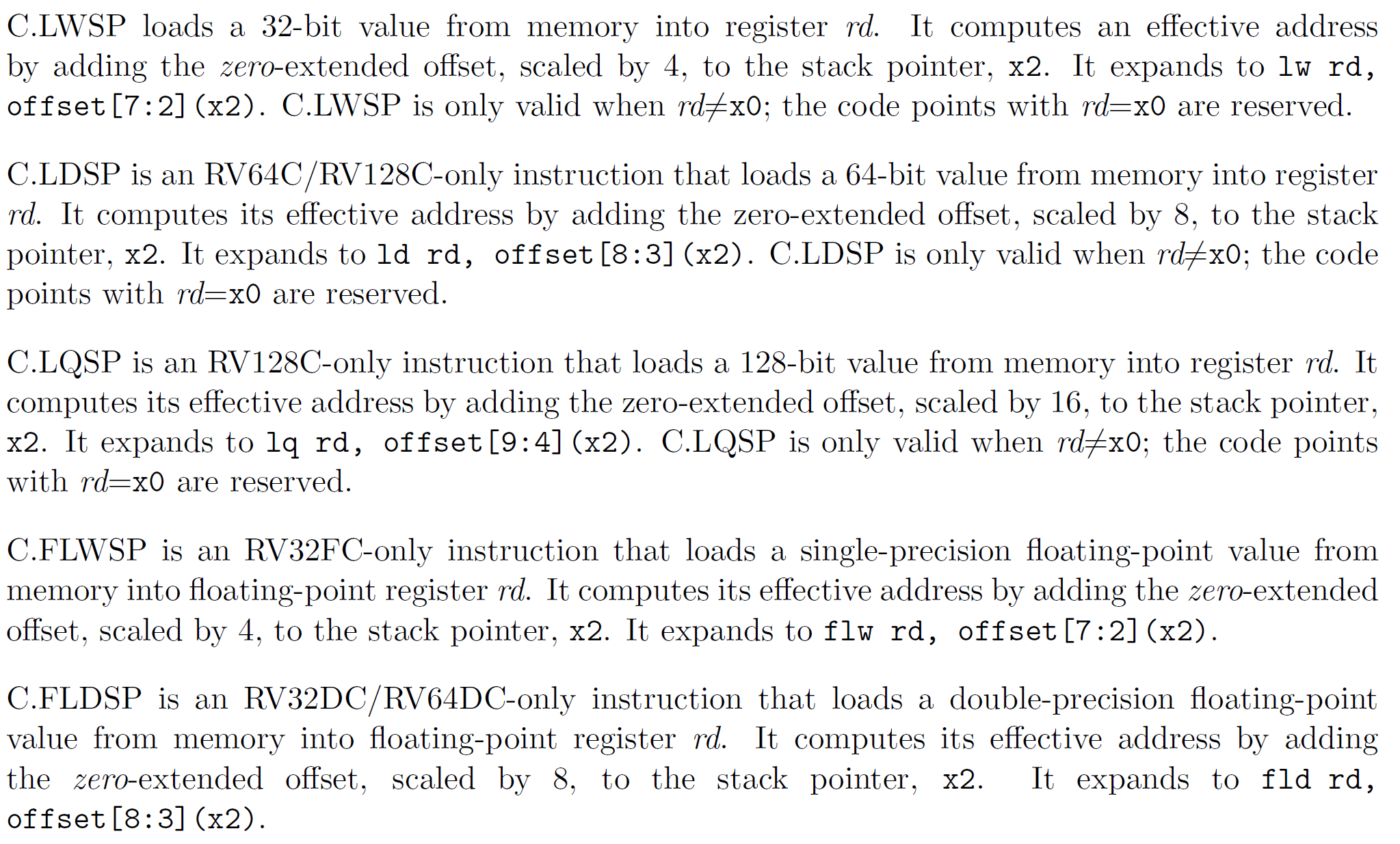 RV64C has several instruction types, and the format is ‘weird’ to say the least. This is mainly to account for the much shorter instruction size.