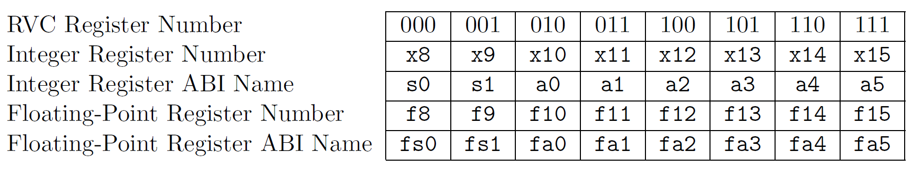 You can see that we have both rs1 and rs1′ as well as rd and rd’. Notice that rd is 5 bits, just like normal, but rs1′ and rd’ are both 3 bits, meaning that only some registers are available. For the 3-bit version, the register is a lookup table, however, if you look at the table, it’s just the 3 bits added to 8.